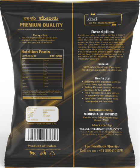 Known as the "King of Spices," Black Pepper is a bold, aromatic spice with a sharp, pungent flavor and a warm, woody fragrance. Sourced from dried, unripe berries of the pepper plant, it is a versatile seasoning used in cuisines worldwide. Whether ground or whole, black pepper enhances the taste of curries, marinades, soups, and salads, and is also valued for its digestive and antioxidant properties.