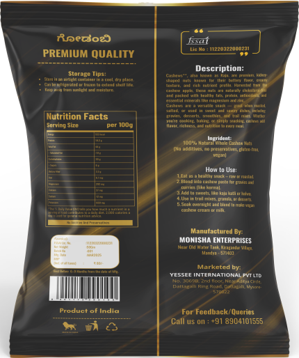 Our premium Cashew Nuts (Kaju) are the perfect combination of rich, buttery flavour and satisfying crunch. Sourced from the best orchards, these cashews are carefully harvested, cleaned, and packed to preserve their natural taste and high nutritional value. Whether you're snacking, adding them to your favourite curry, or using them in desserts like kheer or cookies, these cashews elevate any dish. Known for their smooth texture and mildly sweet taste, our cashew nuts are packed with healthy fats, protein, and essential minerals like magnesium and zinc, making them a nutritious addition to your diet. They’re also an excellent source of energy, making them a great option for a quick, wholesome snack.